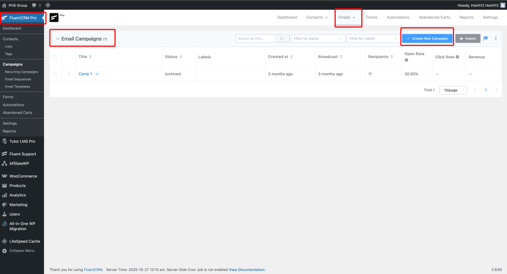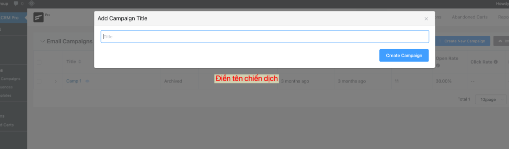 Gửi email theo chiến dịch, chỉ gửi được 1 nội dung mail cho tất cả email trong cùng 1 chiến dịch. Click vào “Create New Campaign” để tạo chiến dịch mới sau đó gửi mail.