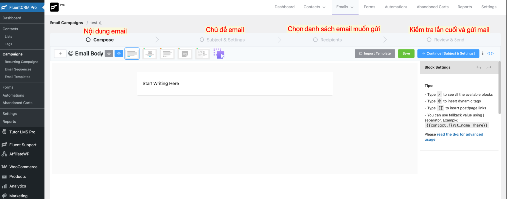 Lưu ý: Trước lúc gửi email có thể ấn “Send a email test” để xem mail hiện tại có gửi được mail không.