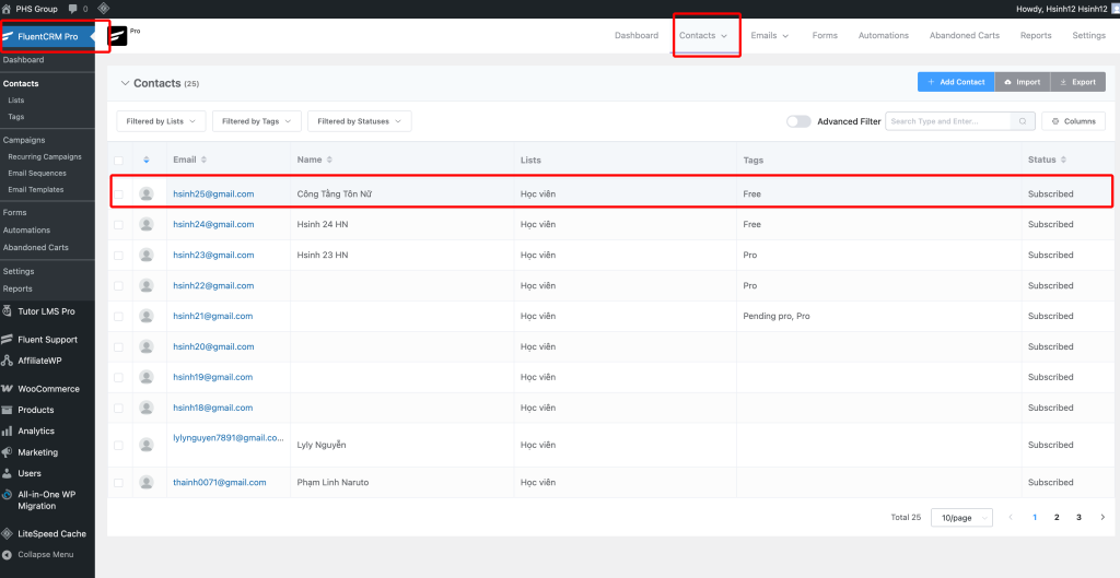 1. Vào tab “Contacts” như ảnh, click vào một email muốn gửi để vào xem chi tiết email.