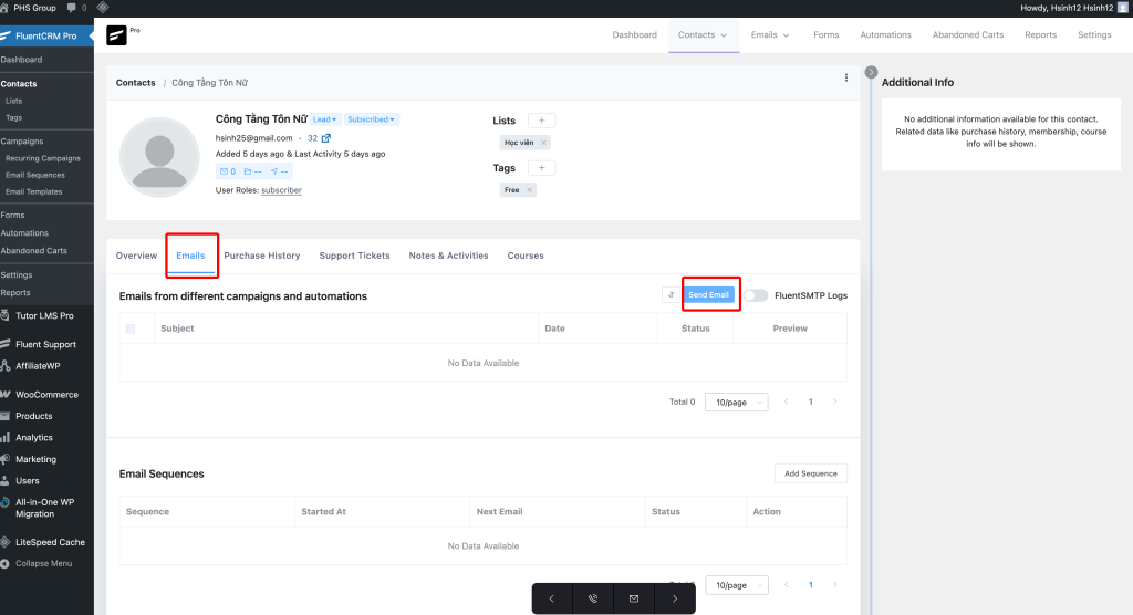 2. Khi vào được màn chi tiết email, vào tab “Emails – Danh sách tất cả email mà hệ thống đã gửi cho học viên này”, sau đó ấn vào nút “Send email” để mở ra popup gửi emai.
