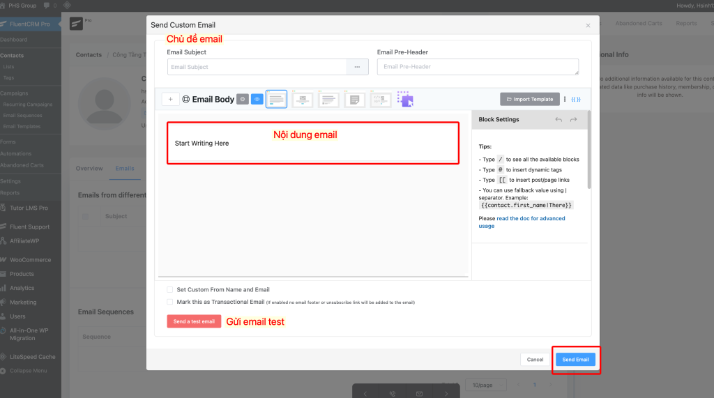 3. Nhập chủ đề và nội dung email, sau đó click “Send Email” để gửi email.