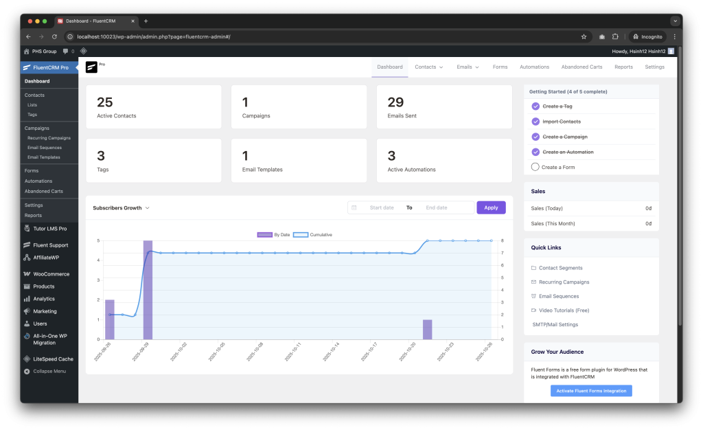 Các nội dung của tab “Dashboard” sẽ hiển thị tổng quan các liên hệ email của website.