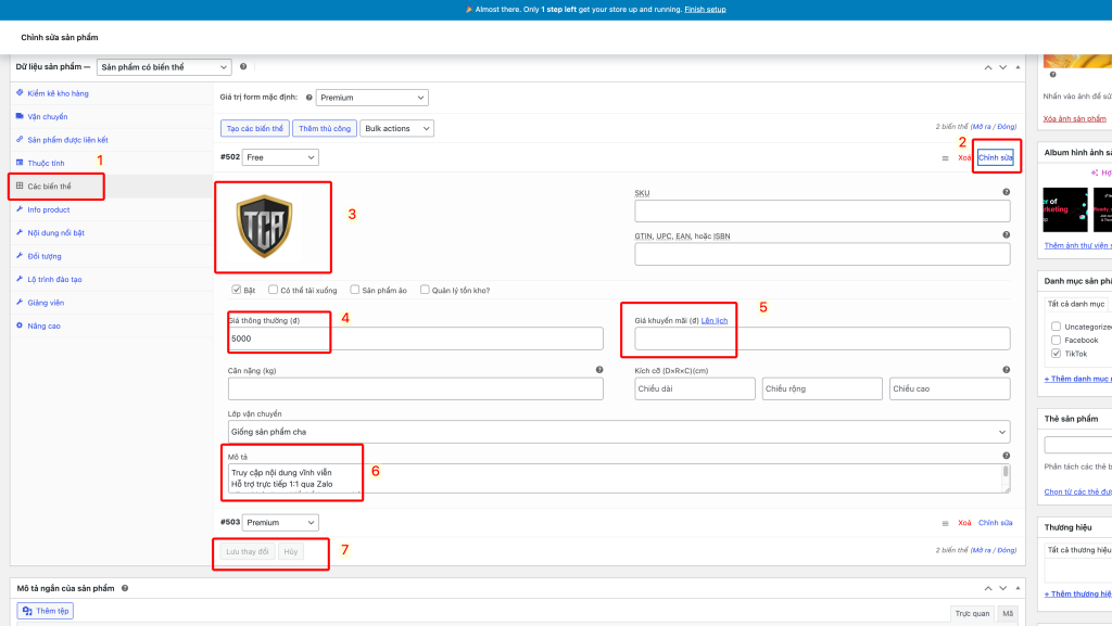Sau đó sang bên Các biến thể để set giá, hình ảnh và mô tả vé. Sau đó sửa như bước 1-7 ở ảnh và ấn Lưu.