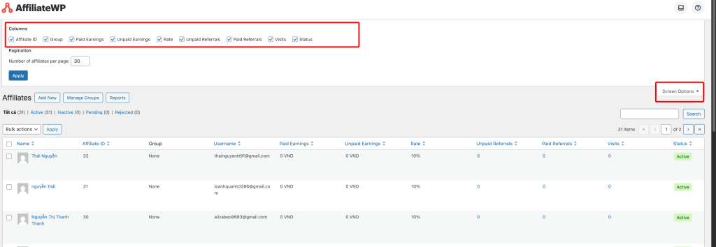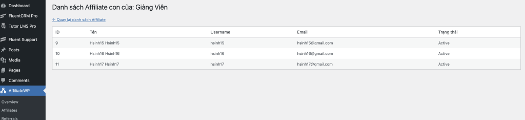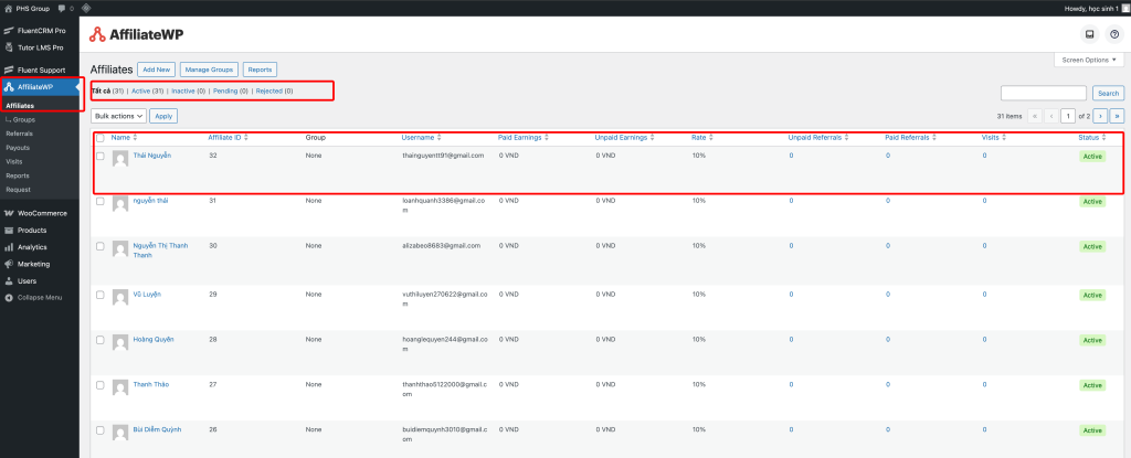 Màn hình bên dưới là danh sách tất cả affiliate đăng ký trên website.