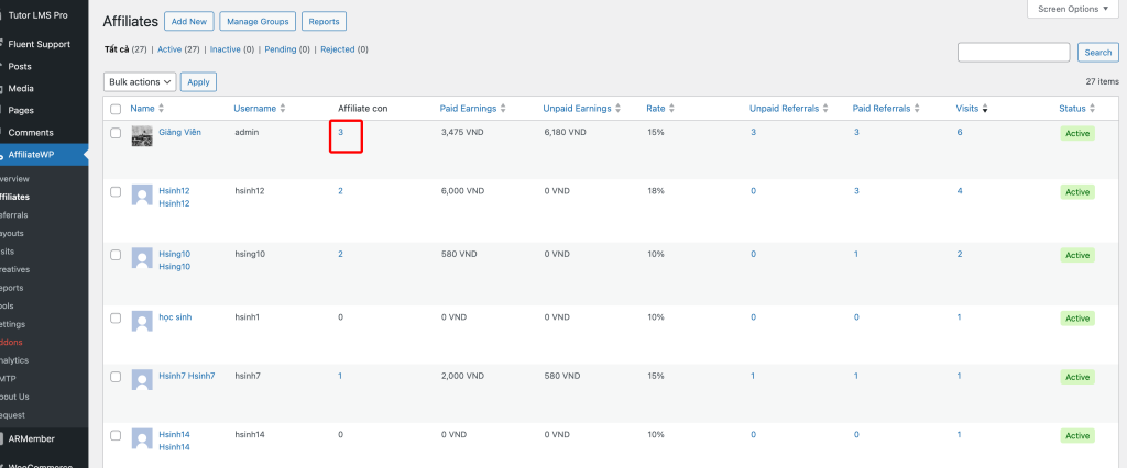 Affiliatewp –> Affiliates –> Click vào ô màu đỏ để xem chi tiết affiliate con của từng affiliate. Để lọc số affiliate con thì click vào cột “visit” sẽ lọc được theo số lượng từ cao đến thấp, từ thấp đến cao, có sai số tương đối.